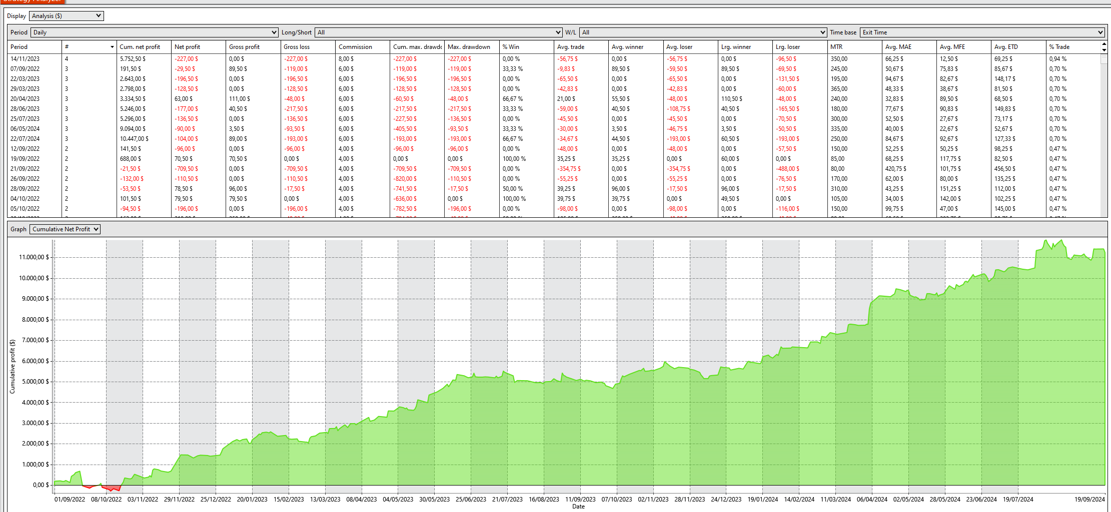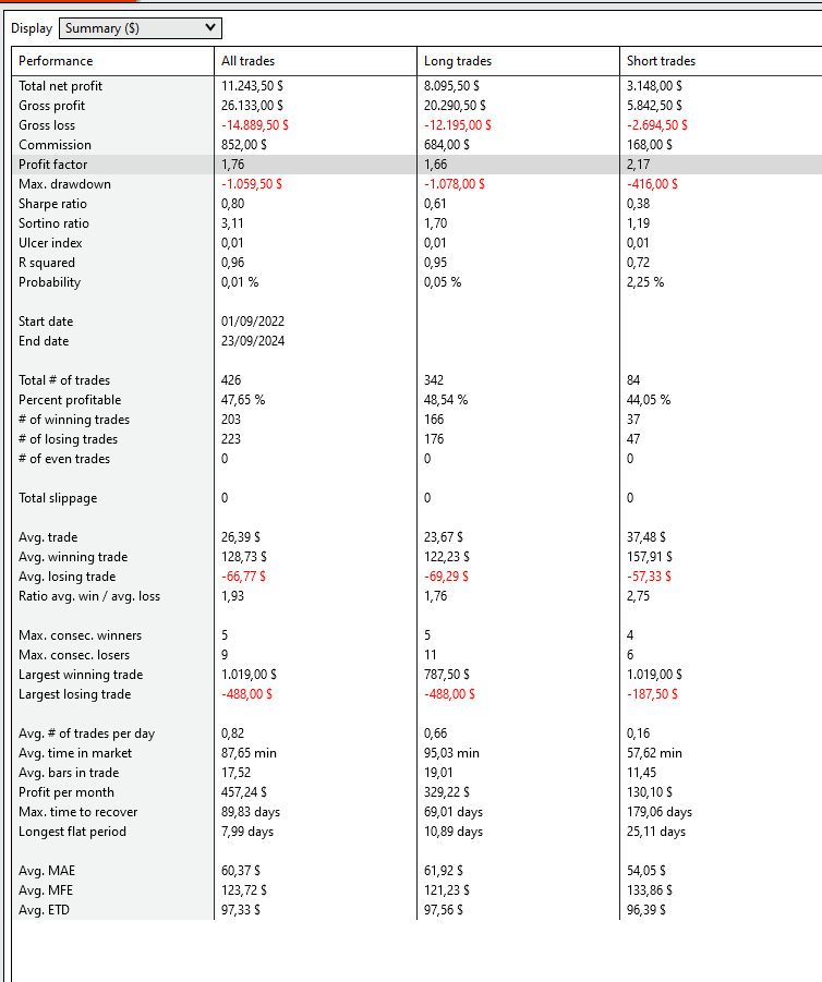 Destacamos un profit factor aceptable en relación con el porcentaje de aciertos; adicionalmente el maxdradown está controlado durante todo el período dado que este máximo drawdown está concentrado en dos meses concretos febrero del 2023 y septiembre del mismo año, recordemos que estamos analizando una serie de 24 meses