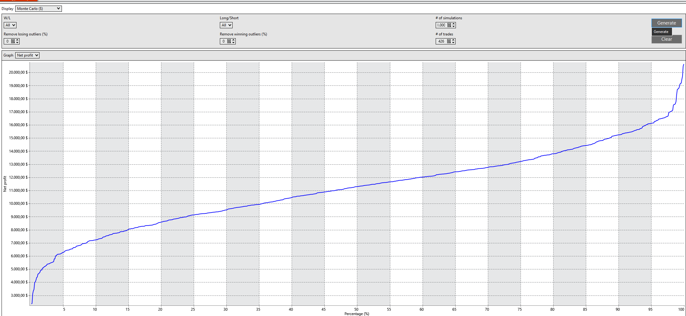Al aplicar el método estadístico Montecarlo al beneficio neto obtenido por nuestro sistema de trading en este período de tiempo vemos que la probabilidad de haber obtenido un beneficio neto mayor de $7000 es mayor del 90% y la probabilidad de obtener un beneficio neto por encima $3000 es mayor del 99%