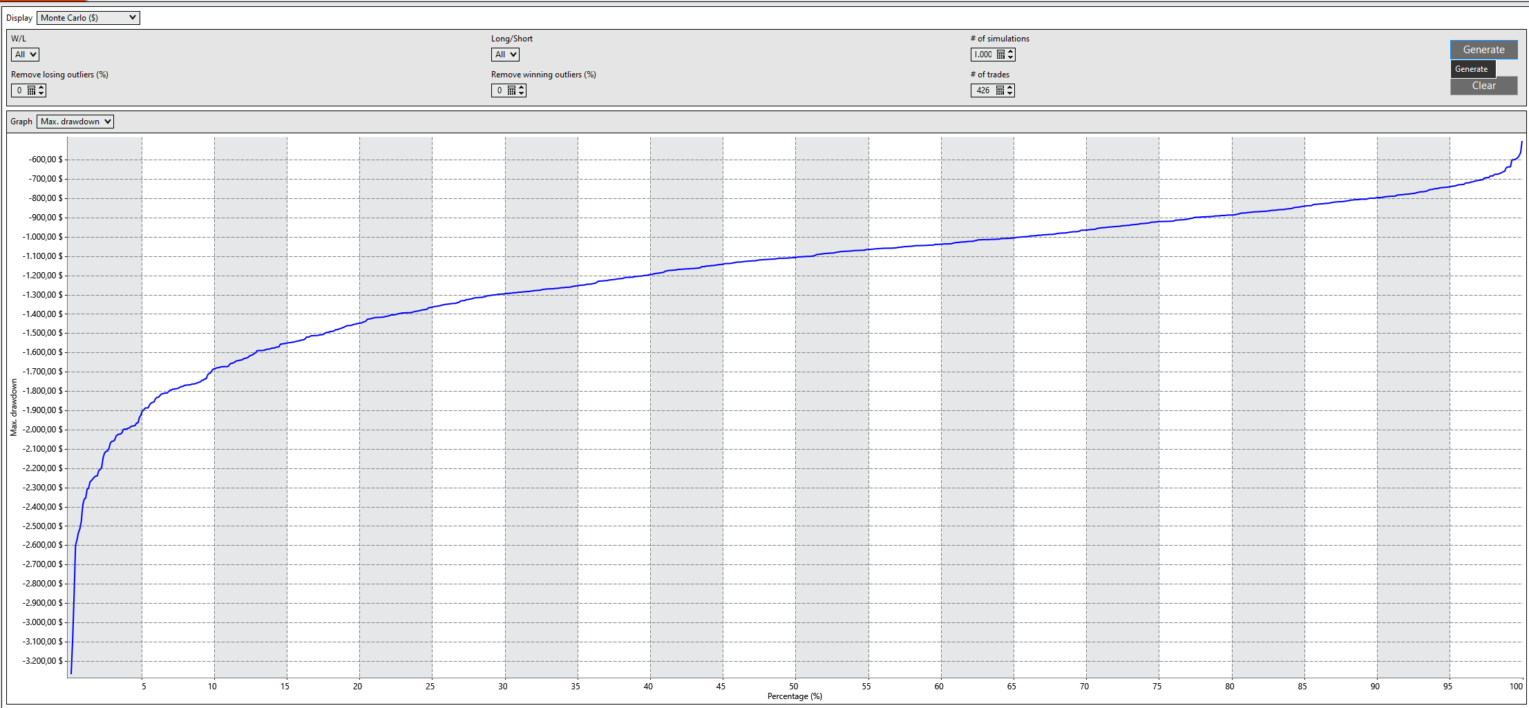 La probabilidad de que el máximo drawdown sea menor de -$1700 es del 90% y que la probabilidad de que este máximo drawdown sea menor de -$2400 es mayor al 99%
